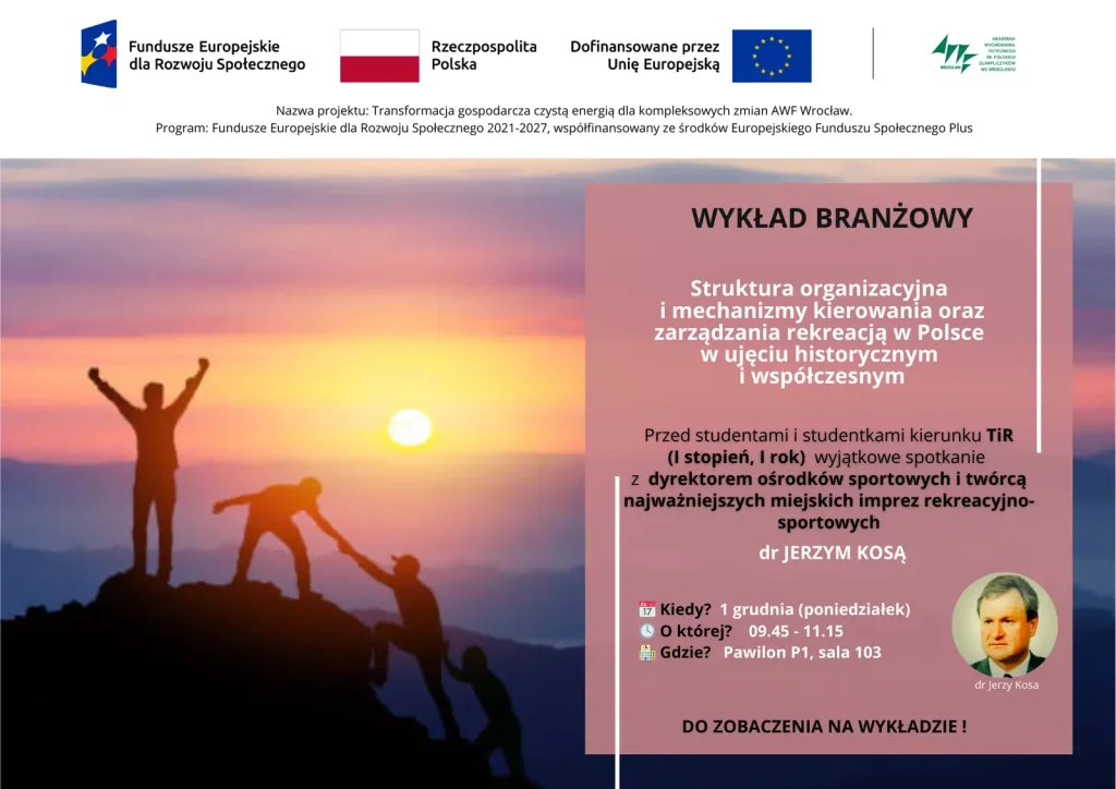 🎙 Wykład poprowadzi dr Jerzy Kosa — dyrektor w takich ośrodkach jak MOSiR, OSiR i MCS, a także twórca najbardziej rozpoznawalnych miejskich wydarzeń rekreacyjno-sportowych, m.in.: